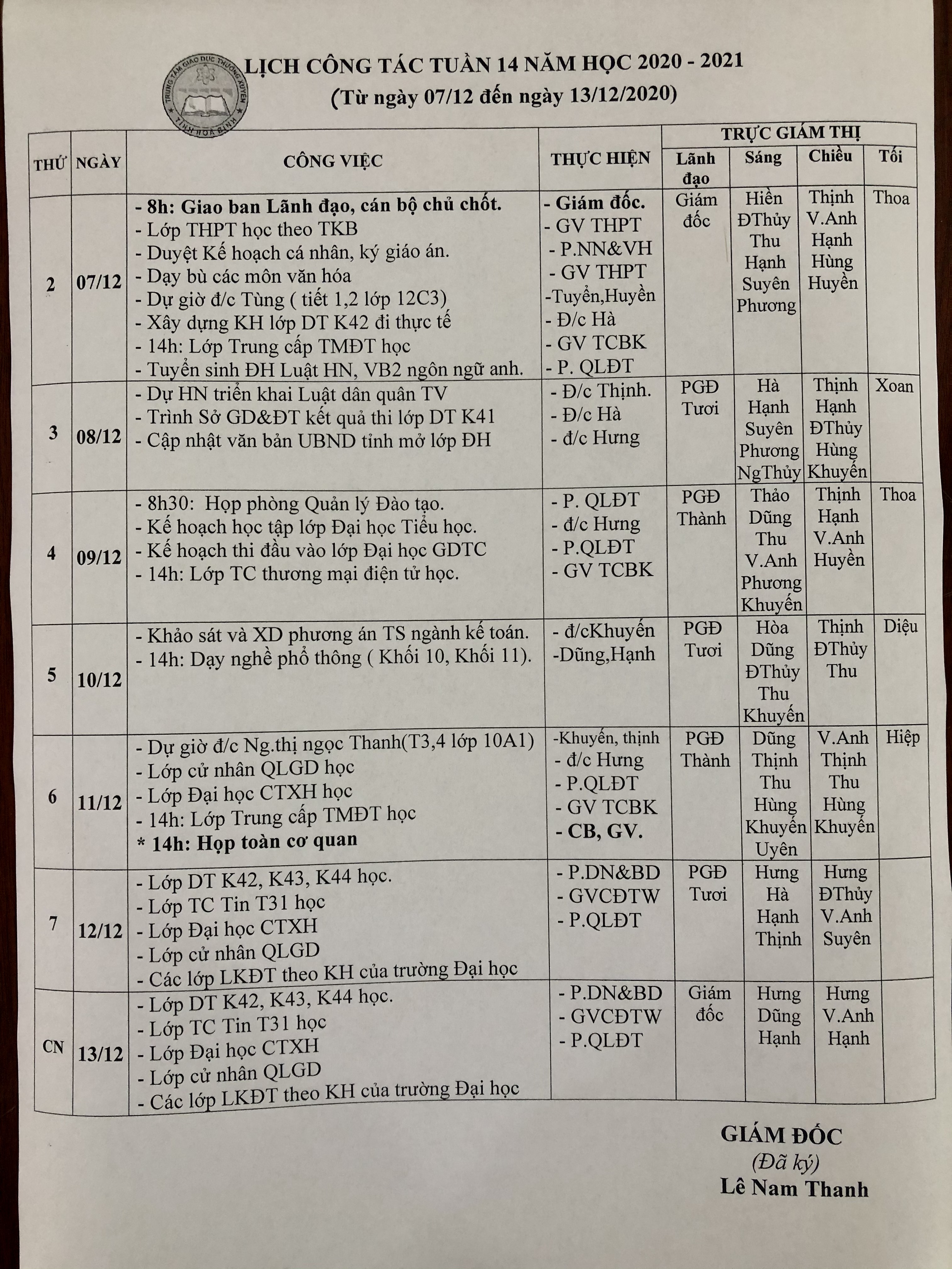 LỊCH TUẦN 32 (12-18/4/2021)