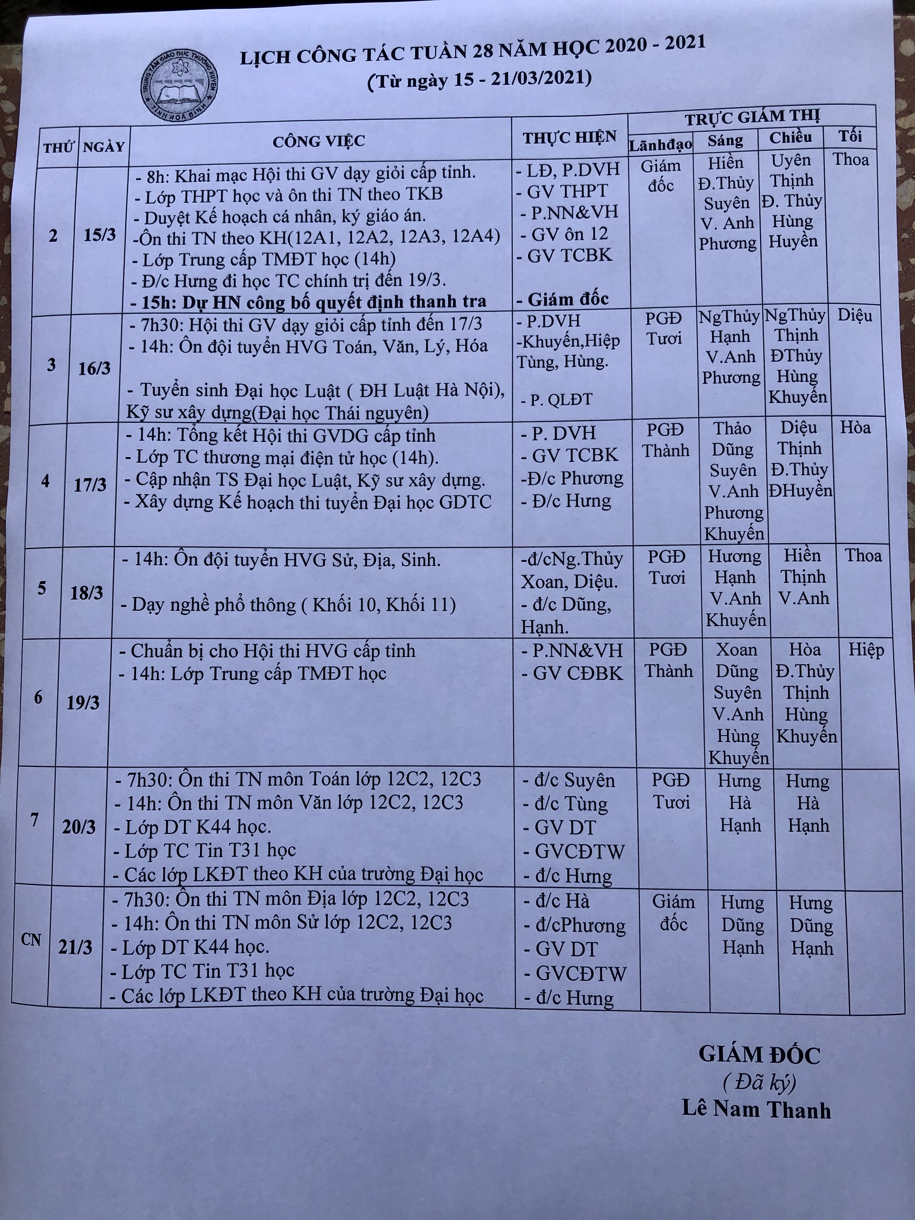 LỊCH TUẦN 28 (15-21/3/2021)