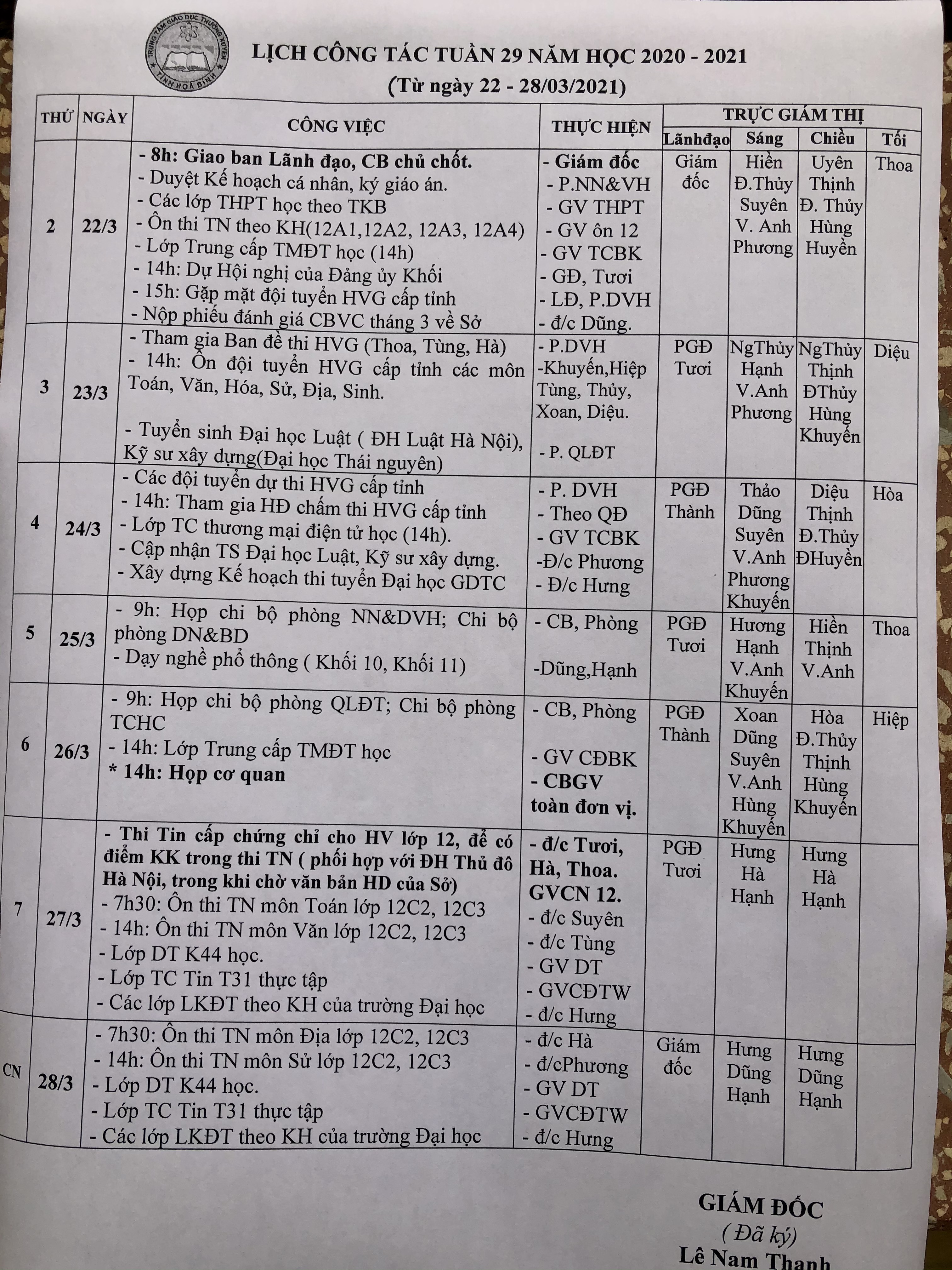 LỊCH TUẦN 30 (29/3-04/4/2021)
