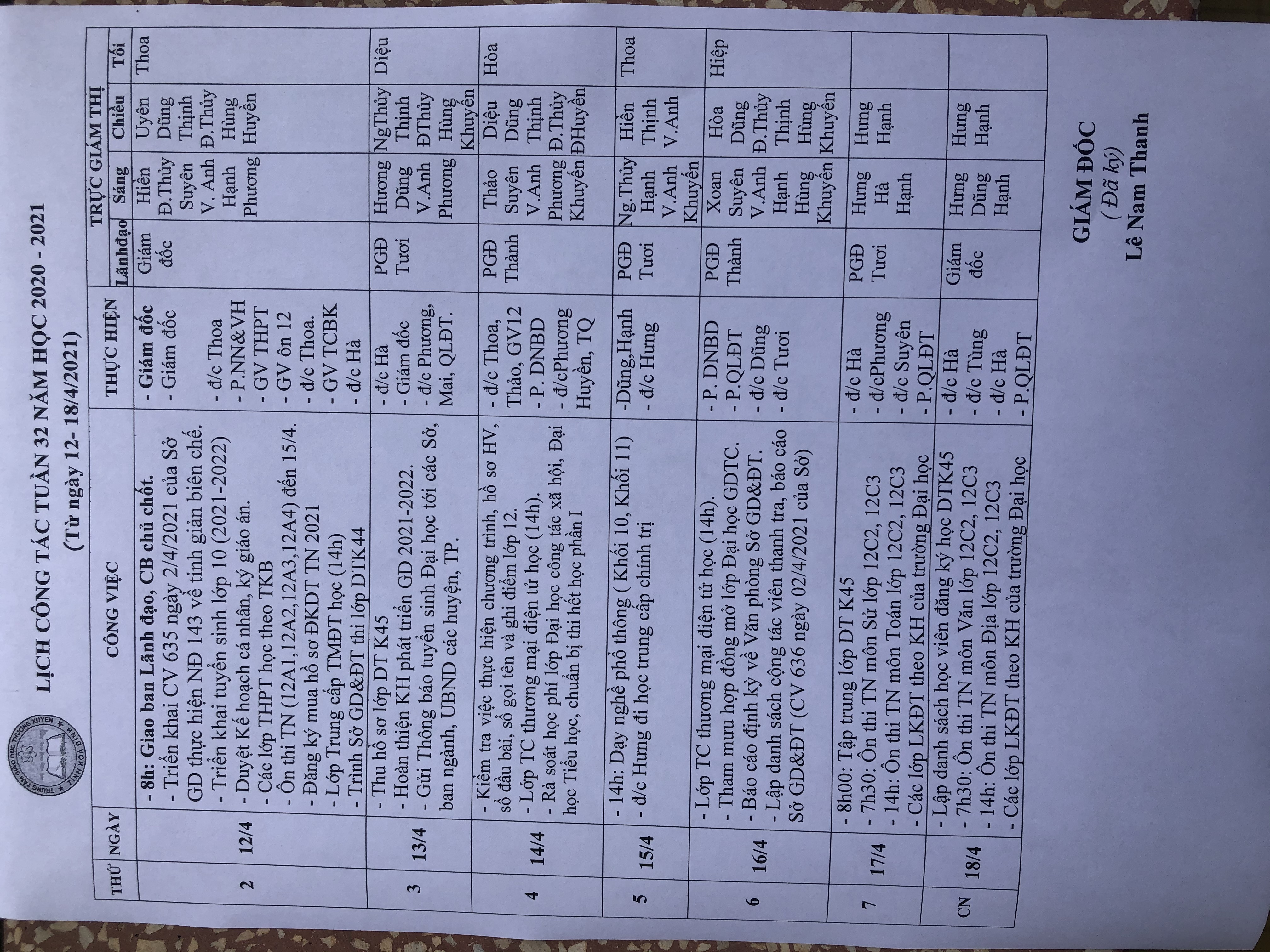 LỊCH TUẦN 32 (12-18/4/2021)