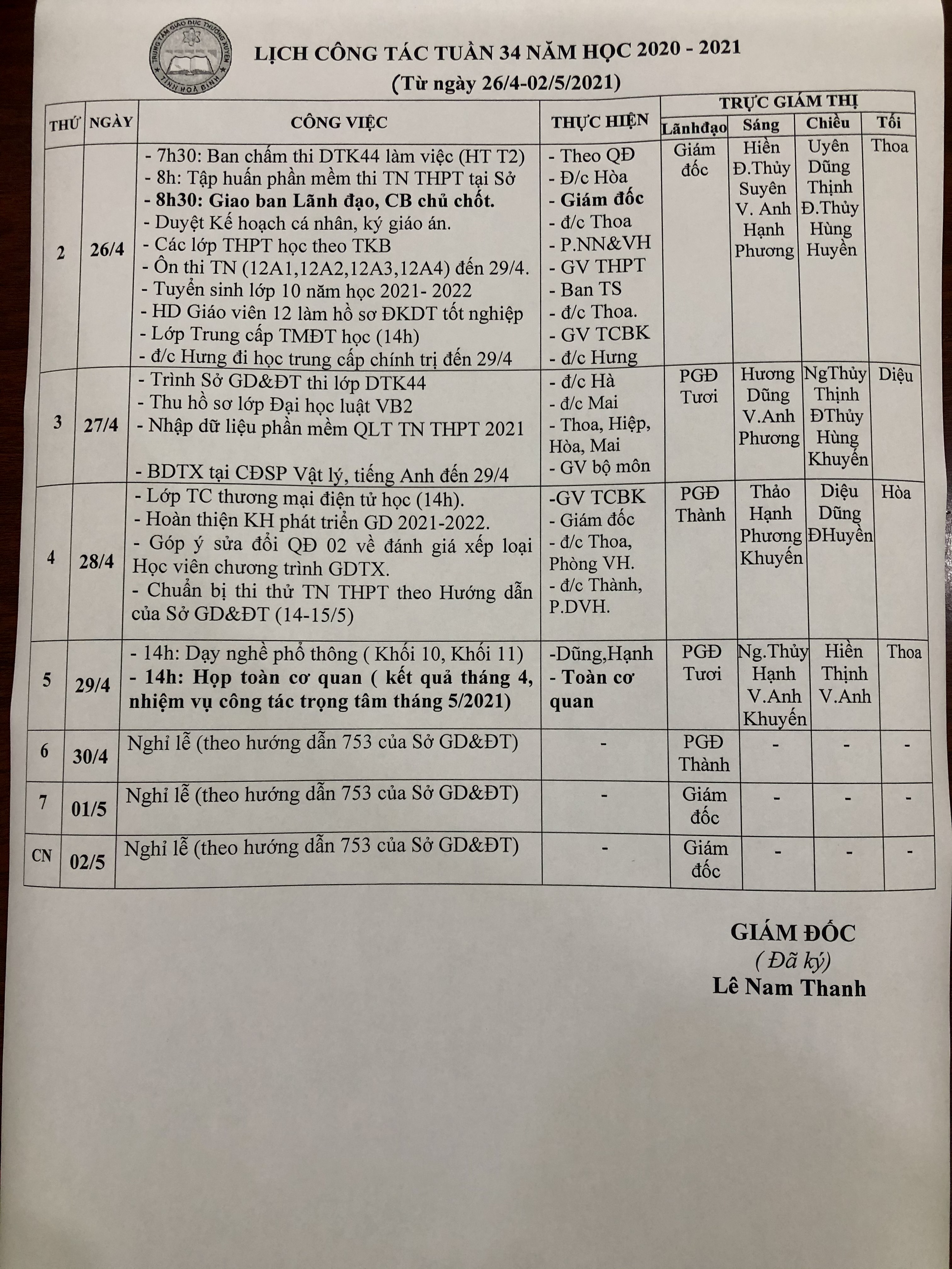 LỊCH TUẦN 34 (26/4-02/5/2021)